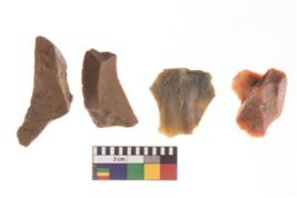 | Description / विवरण | There are n 4 utilized flakes. There are multi directional irregular scar pattern on both dorsal and ventral face of the flakes. two are chalcedony, and two are chert, two are tapering, and two are sharp edges. |