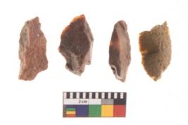 | Description / विवरण | There are n 4 utilized flakes. There are multi directional irregular scar pattern on both dorsal and ventral face of the flakes. three are chalcedony, and one has chert, two are tapering, and two are blunted edges. |