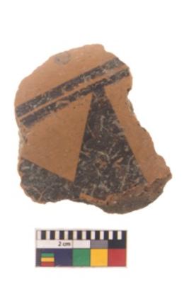 | Description / विवरण | Specimen of black on red ware with black decorative Double axe like design geometric painting. |