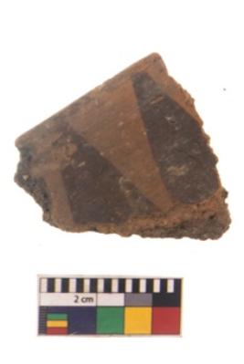 | Description / विवरण | Specimen of black on red ware with black decorative Group of elongated vertical triangles geometric painting. |