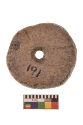 | Description / विवरण | Specimen of terracotta Wheel. It is red ware rounded shape with center perforation. |
