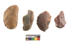 | Description / विवरण | There are n 4 utilized flakes. There are multi directional irregular scar pattern on both dorsal and ventral face of the flakes. two are tapering edges, and two are blunted edges. |