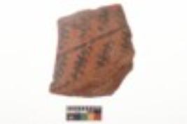 | Description / विवरण | Specimen of black on red ware with black decorative Vertical lines and row of arcs with short vertical strokes geometric painting. |
