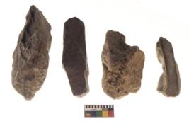 | Description / विवरण | There are n 4 flakes tool; there are multidirectional irregular scar pattern on them; made of short flakes and all four have tapering edges. |