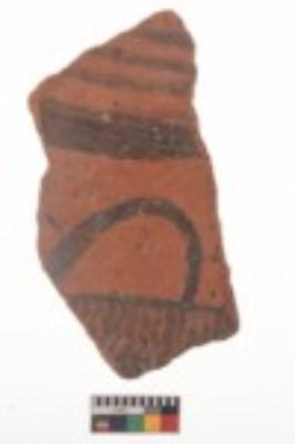 | Description / विवरण | Specimen of black on red ware with black decorative Wavy lines and dome like design geometric painting. |