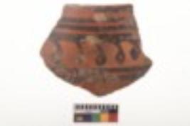 | Description / विवरण | Specimen of black on red ware with black decorative Horizontal bands and suspended loop with circle on the left geometric painting. |