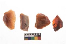 | Description / विवरण | There are n 4 utilized flakes. There are multi directional irregular scar pattern on both dorsal and ventral face of the flakes. two are tapering at one end and two are sharp edges. |