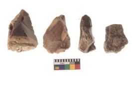 | Description / विवरण | There are n 4 flakes tool; there are multidirectional irregular scar pattern on them; made of short flakes and all four have tapering edges. |