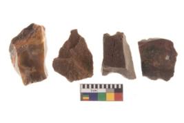 | Description / विवरण | There are n 4 utilized flakes. There are multi directional irregular scar pattern on both dorsal and ventral face of the flakes. one has chalcedony, and three are chert, one has sharp edges, and three are tapering edges, at one end. |