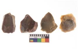 | Description / विवरण | There are n 4 utilized flakes. There are multi directional irregular scar pattern on both dorsal and ventral face of the flakes. one has chalcedony, and three are chert, one has sharp edges, and three are tapering edges, at one end. |