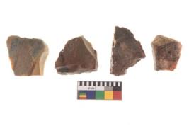 | Description / विवरण | There are n 4 utilized flakes. There are multi directional irregular scar pattern on both dorsal and ventral face of the flakes. one has chalcedony, and three are chert, one has sharp edges, and three are tapering edges, at one end. |
