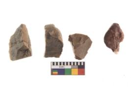 | Description / विवरण | There are n 4 utilized flakes. There are multi directional irregular scar pattern on both dorsal and ventral face of the flakes. three are tapering at one end and one has sharp edge. |