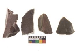 | Description / विवरण | There are n 4 utilized flakes. There are multi directional irregular scar pattern on both dorsal and ventral face of the flakes. three are tapering at one end and one has sharp edge. |