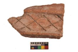 | Description / विवरण | Specimen of red ware with engraved decorative Lattice design geometric painting. |