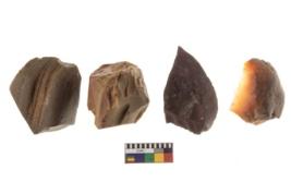 | Description / विवरण | There are n 4 utilized flakes. There are multi directional irregular scar pattern on both dorsal and ventral face of the flakes. Three are chert, and one has chalcedony, two are pointed and sharp at one end and two are rounded and broom marks, edges. |