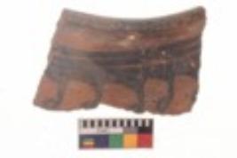 | Description / विवरण | Specimen of black on red ware with black decorative Arch like design and suspended loop with circle on the left geometric painting. |