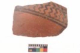 | Description / विवरण | Specimen of black on red ware with black decorative Wavy design and horizontal lines geometric painting. |