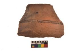| Description / विवरण | Specimen of black on red ware with black decorative Vertical lines intersecting horizontal lines geometric painting. |