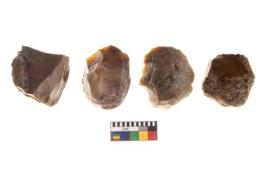 | Description / विवरण | There are n 4 utilized flakes. There are multi directional irregular scar pattern on both dorsal and ventral face of the flakes. Two have chalcedony, and two have chert, one has tapering at one end and three have rounded edges, |