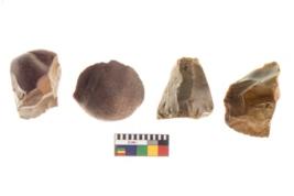 | Description / विवरण | There are n 4 utilized flakes. There are multi directional irregular scar pattern on both dorsal and ventral face of the flakes. three are tapering at one end and one has rounded edge, |