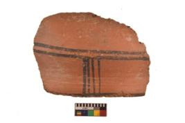 | Description / विवरण | Specimen of black on red ware with black decorative Vertical lines intersecting horizontal lines geometric painting. |