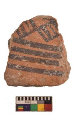 | Description / विवरण | Specimen of black on red ware with black decorative Horizontal bands and lattice geometric painting. |