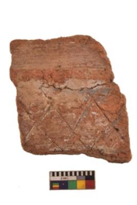 | Description / विवरण | Specimen of red ware with engraved decorative Lattice design geometric painting. |