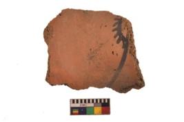 | Description / विवरण | Specimen of black on red ware with black decorative Row of arcs with short vertical strokes as in half set sun geometric and nature painting. |