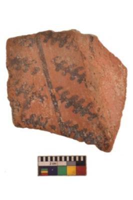 | Description / विवरण | Specimen of black on red ware with black decorative Leaf ike design nature painting. |