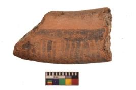 | Description / विवरण | Specimen of black on red ware with black decorative Group of parallel vertical lines and horizontal band geometric painting. |