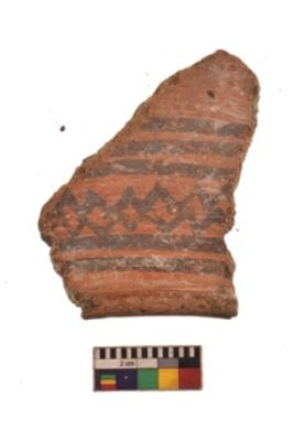 | Description / विवरण | Specimen of black on red ware with black decorative Lattice and horizontal lines geometric painting. |