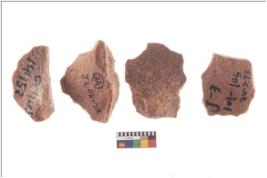 | Description / विवरण | There are n 4 utilized flake cores. There are multidirectional irregular scar pattern on both dorsal and ventral face of the flake cores. One has sharp edges and three have blunted edges. |
