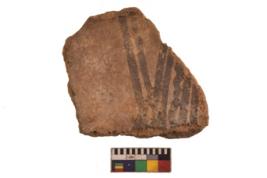 | Description / विवरण | Specimen of black on red ware with black decorative Wavy and vertical lines geometric painting. |