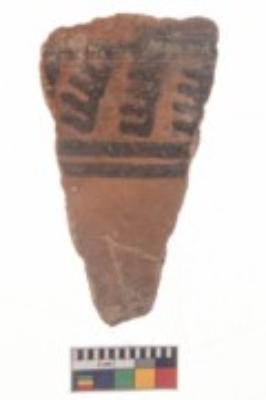 | Description / विवरण | Specimen of black on red ware with black decorative Vertical lines and row of arcs with short vertical strokes geometric painting. |