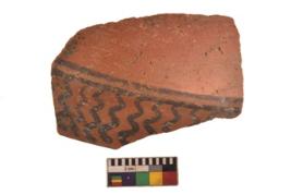 | Description / विवरण | Specimen of black on red ware with black decorative Wavy lines geometric painting. |