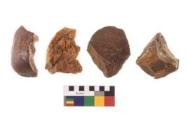 | Description / विवरण | There are n 4 utilized flakes. There are multi directional irregular scar pattern on both dorsal and ventral face of the flakes. three are tapering at one end and one has sharp edge. |