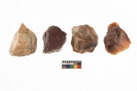 | Description / विवरण | There are n 4 utilized flakes. There are multi directional irregular scar pattern on both dorsal and ventral face of the flakes; three have chert, and one has chalcedony, three have tapering at one end and one has sharp edge. |