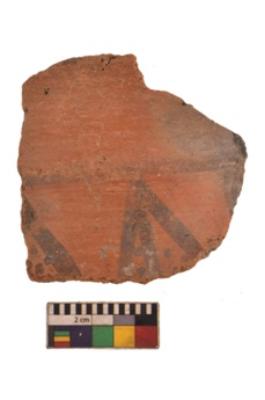 | Description / विवरण | Specimen of black on red ware with black decorative Triangles and dots geometric painting. |