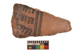 | Description / विवरण | Specimen of black on red ware with black decorative Row of arcs with short vertical strokes geometric painting. |