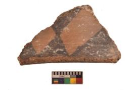| Description / विवरण | Specimen of black on red ware with black decorative Broad double axe like design geometric painting. |