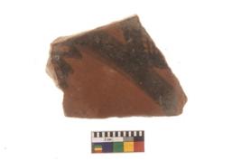 | Description / विवरण | Specimen of Potsherd black on red painted pottery. It is fine fabric in sharp contrast with painted design are executed in black pigment. |