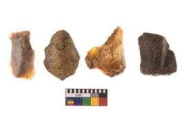 | Description / विवरण | There are n 4 utilized flakes. There are multi directional irregular scar pattern on both dorsal and ventral face of the flakes; Two have chalcedony, and two have chert, one has sharp edges, and three have tapering edges, at one end. |