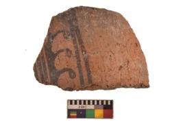 | Description / विवरण | Specimen of black on red ware with black decorative Arch like design with suspended loop with the circle on the right geometric painting. |