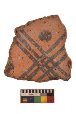 | Description / विवरण | Specimen of black on red ware with black decorative Intersecting lines and dots geometric painting. |
