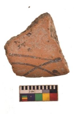 | Description / विवरण | Specimen of black on red ware with black decorative Curves and dots geometric painting. |