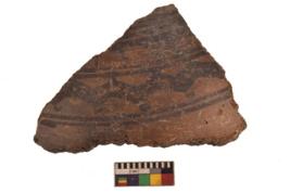 | Description / विवरण | Specimen of black on red ware with black decorative Curves and dots geometric painting. |