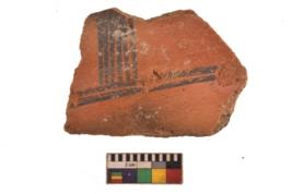 | Description / विवरण | Specimen of black on red ware with black decorative Vertical lines intersecting horizontal lines geometric painting. |