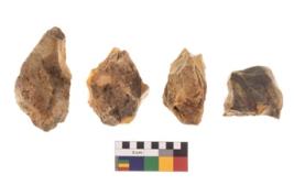 | Description / विवरण | There are n 4 utilized flakes. There are multi directional irregular scar pattern on both dorsal and ventral face of the flakes. two have chalcedony, and two have chert, two have tapering at one end and two have pointed edges. |