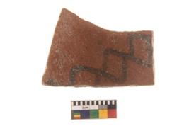 | Description / विवरण | Specimen of Potsherd with black decorative geometric diamond set broad horizontal bands painting. |