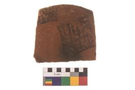 | Description / विवरण | Specimen of Potsherd with black decorative geometric diamond set broad horizontal bands painting. |